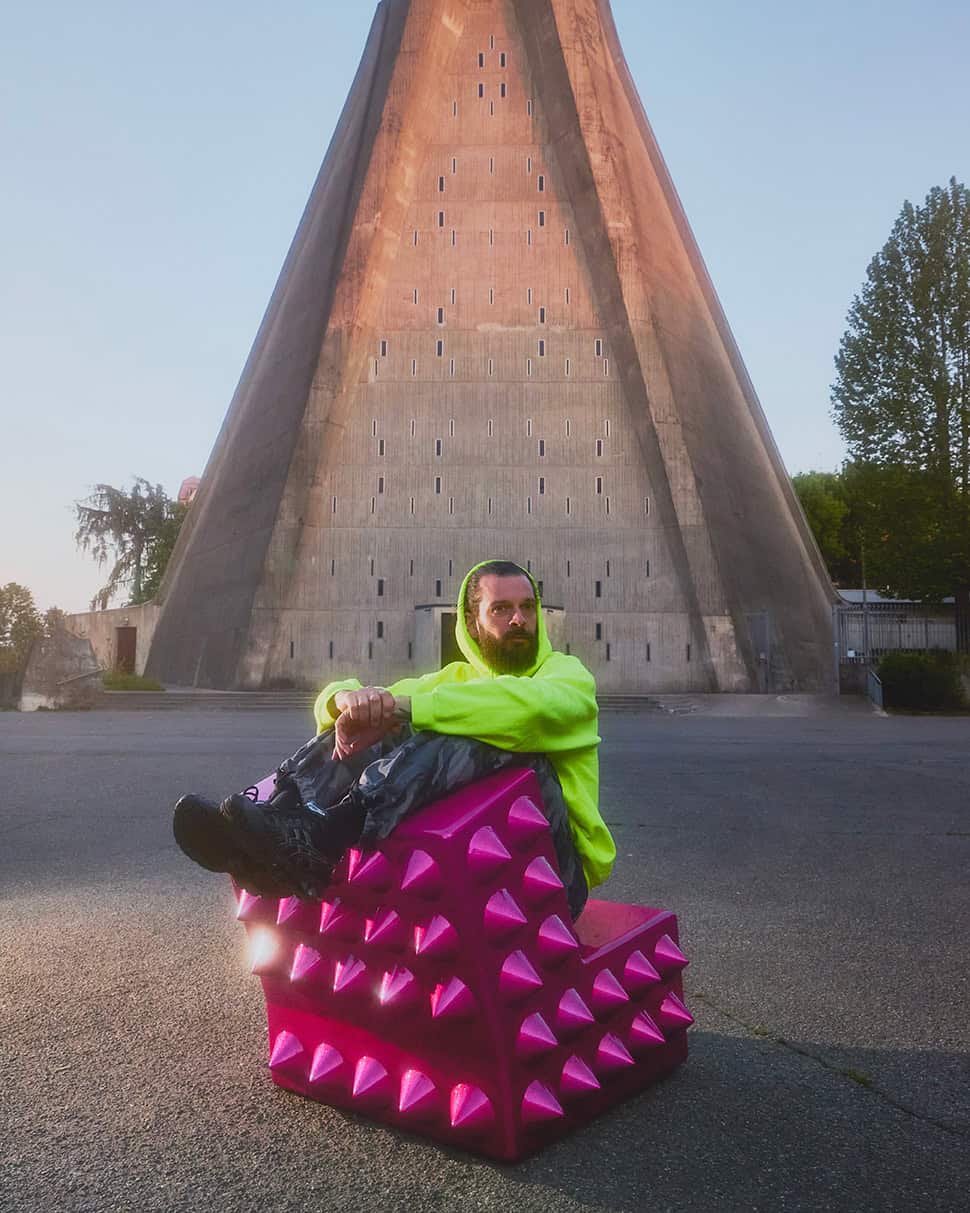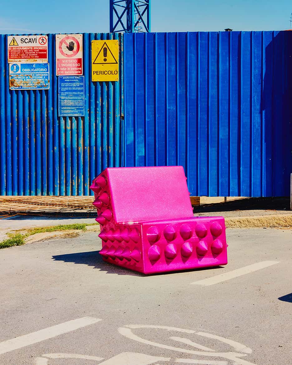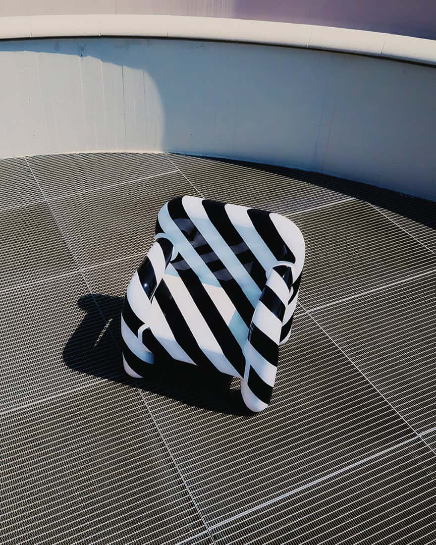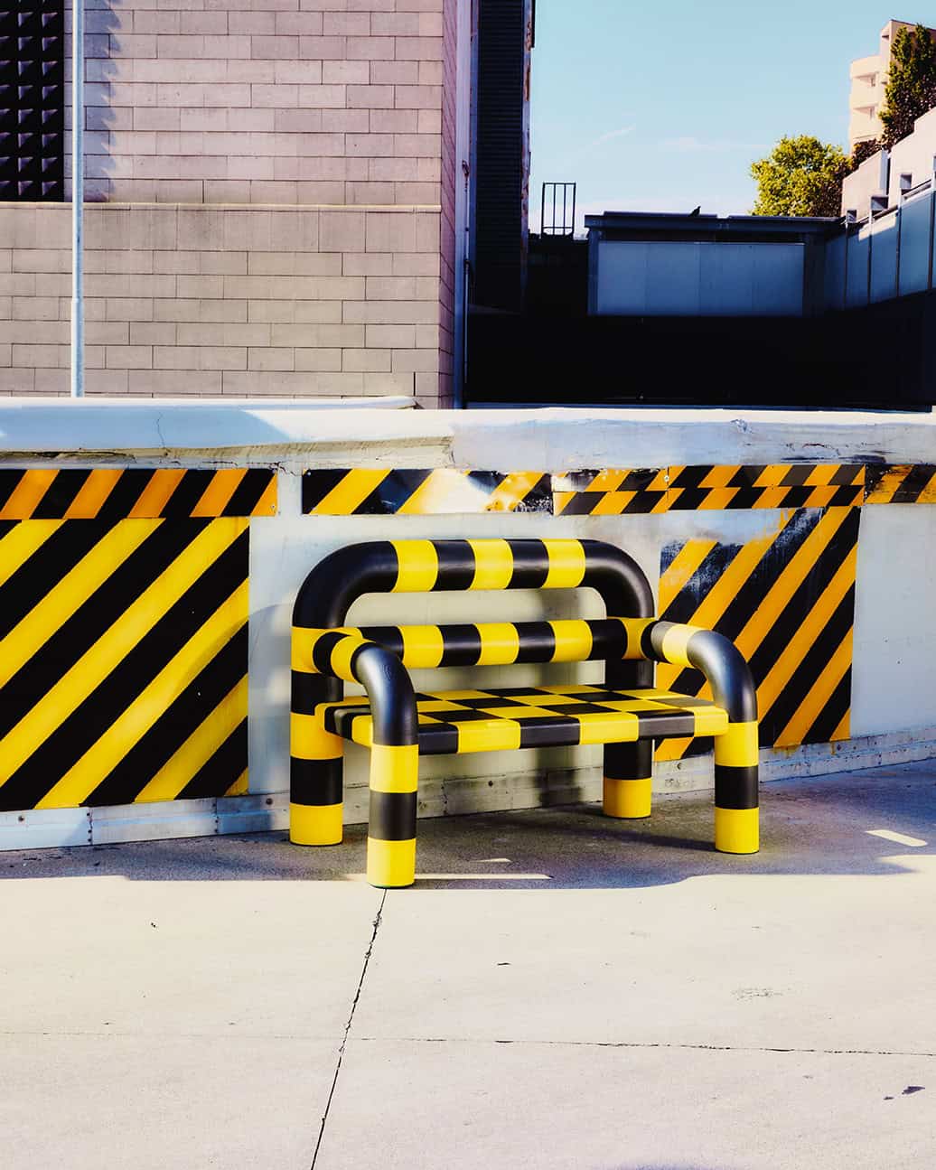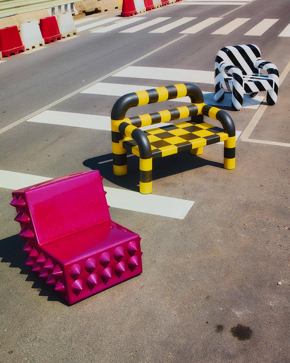 Die Kollektion übersetzt diese Systeme in skulpturale Sitzobjekte. Grafische Signale werden zu Volumen, Warnfarben zu Material, Kontrolle zu physischer Präsenz. Was im Stadtraum Distanz erzeugt, wird hier in Nähe überführt.
