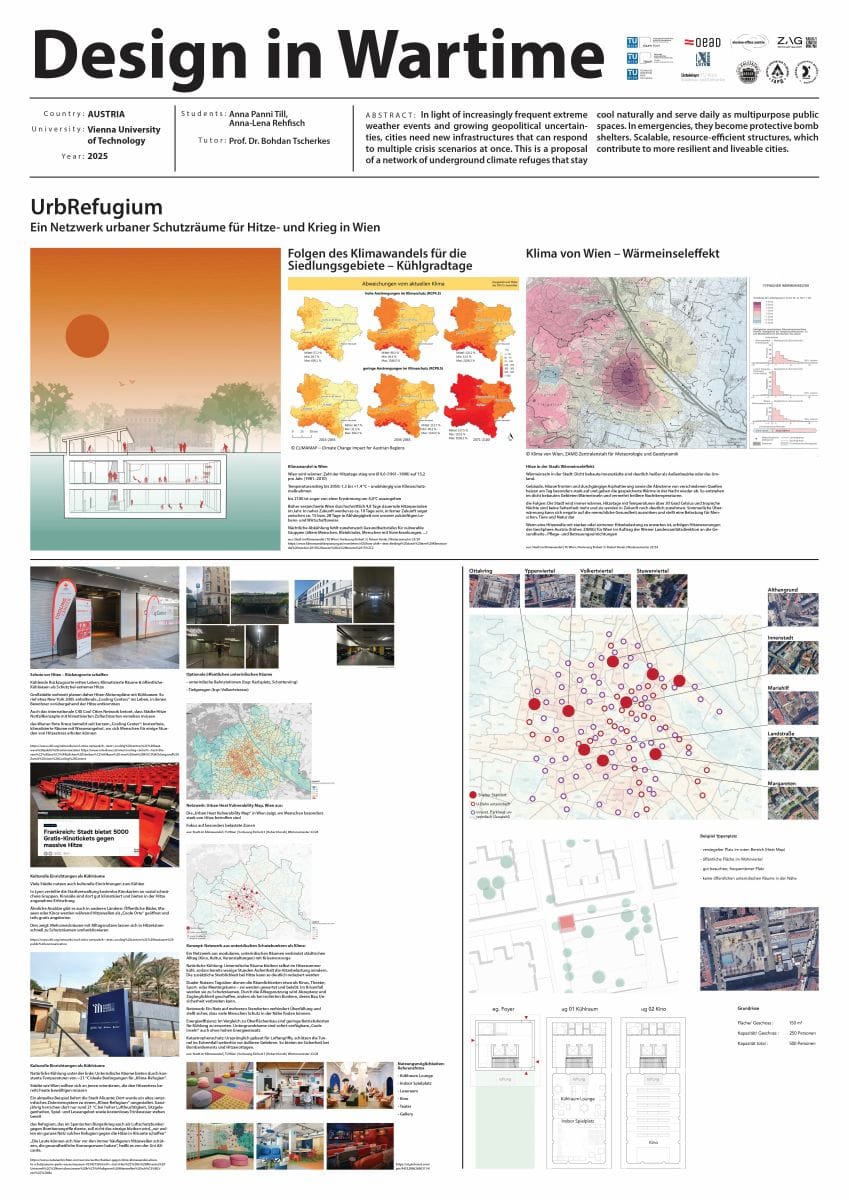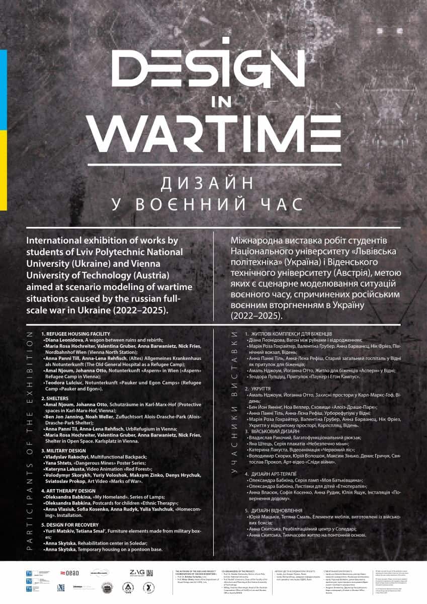 The exhibition “Design in Wartime” presents nineteen projects by Ukrainian and Austrian students of architecture and design, addressing the spatial, social, and cultural challenges of living in times of war. At its core lies the question of how architecture and design can respond to threat, destruction, and uncertainty—and what forms of protection, community, and hope they are capable of creating within the urban environment.